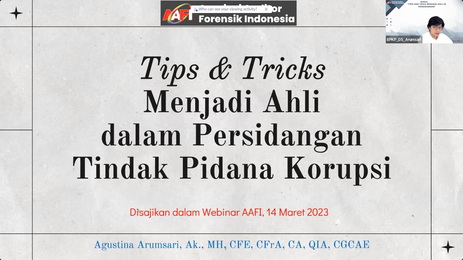Terkait hal itu, AAFI ACEH TIMUR menggelar webinar bertajuk Tips and Tricks Menjadi Ahli di Persidangan yang menghadirkan Ibu Agustina Arumsari, Ak., M.H., CFE, CFrA, CA, QIA, CGCAE (Deputi Investigasi BPKP) sebagai Narasumber dan Ibu Dr. Selvia Vivi Devianti S.E., M.Sc., MCP., Ak, CFrA, CFE, CSFA (Direktur Litbang BPK RI) selaku Moderator.�