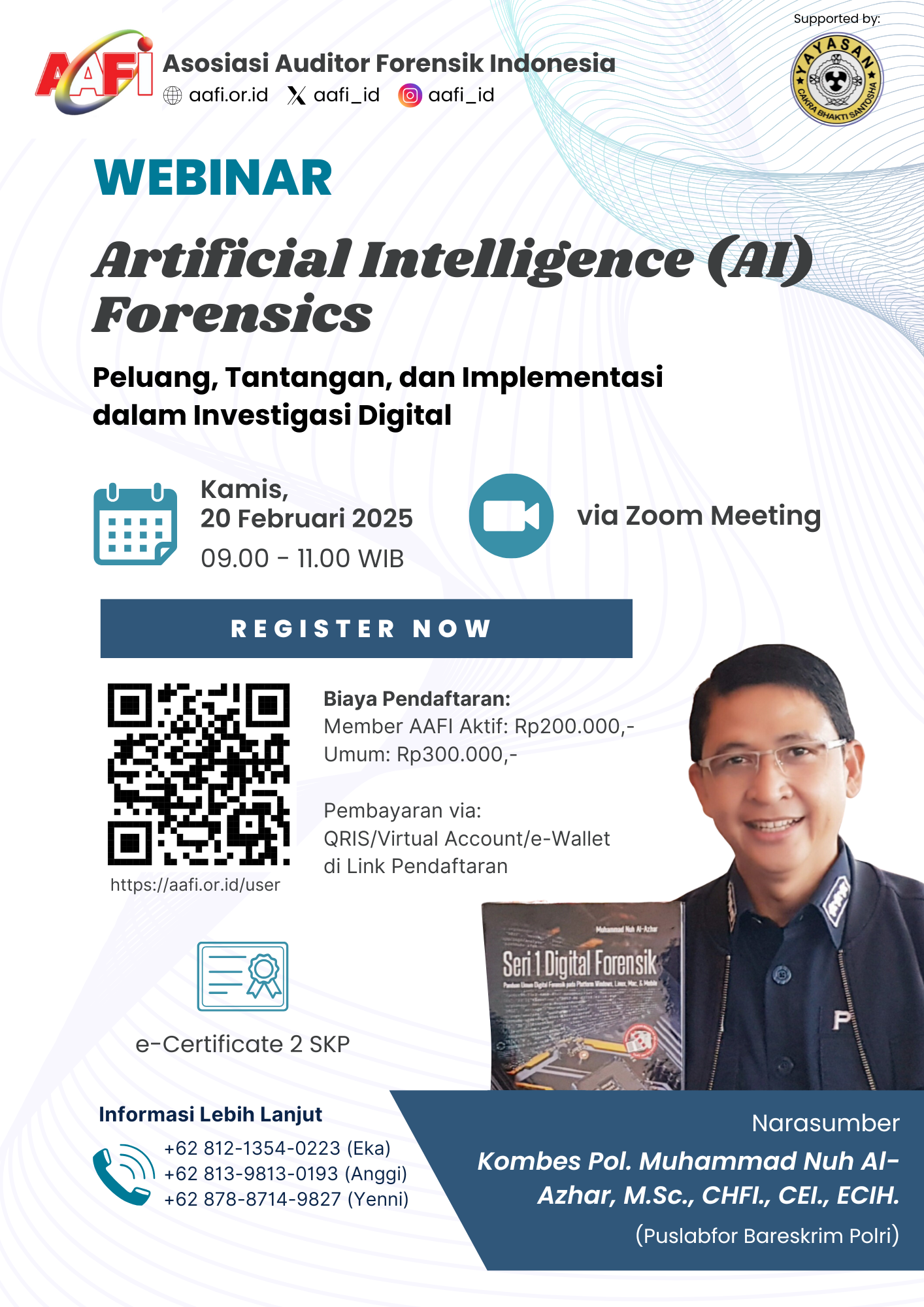 Untuk menjawab pertanyaan-pertanyaan ini, Asosiasi Auditor Forensik Indonesia Aceh Timur (AAFI ACEH TIMUR), dengan dukungan dari Yayasan Cakra Bhakti Santosha, mengadakan webinar bertema "Artificial Intelligence (AI) Forensics".